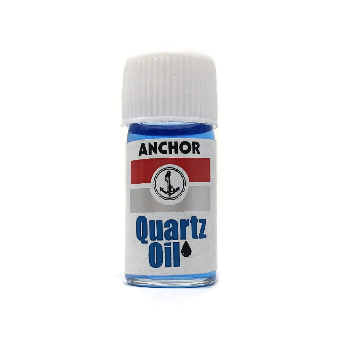 L'olio per orologi al quarzo Anchor, appositamente progettato per l'uso su orologi analogici al quarzo, in particolare sui perni del rotore, sulla ruota a scatto del tiretto e sul treno di ingranaggi.